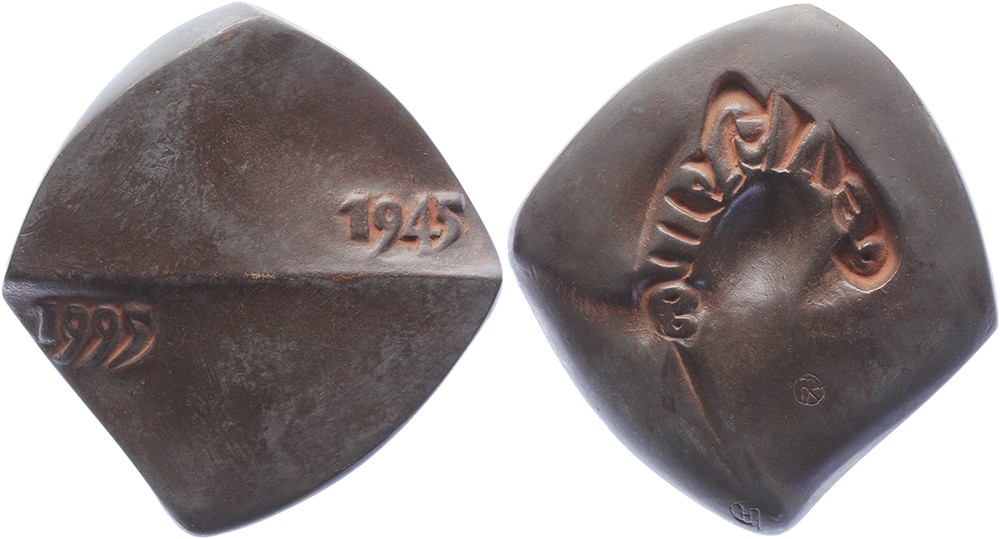 1995 Vijftig jaar bevrijding. Jaartallen 1945 en 1995 verdeeld over twee vlakken. / Woord bevrijding incuus in vlagvorm. Æ gegoten ± 95 x 100. Tilanus pag. 523-525. Hanneke Mols-van Gool. Prachtig.