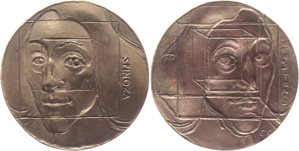 (2001) Dubbelportret Benedictus de Spinoza. Portret Spinoza in vierkant. / Hetzelfde portret in spiegelbeeld. Æ gegoten 98-99. Eric Claus. Prachtig.