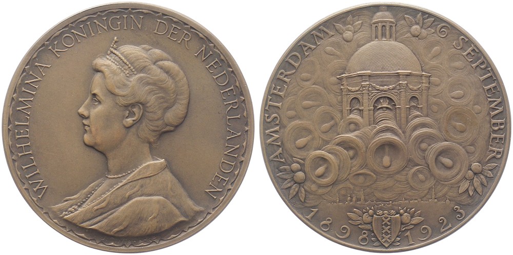 1923 25-Jarig regeringsjubileum Wilhelmina. Borstbeeld koningin Wilhelmina met diadeem en hermelijnen mantel naar links. / Paleiskoepel met klanken verspreidend carillon boven silhouet van Amsterdam. Æ 59. KB II-332. Prachtig.