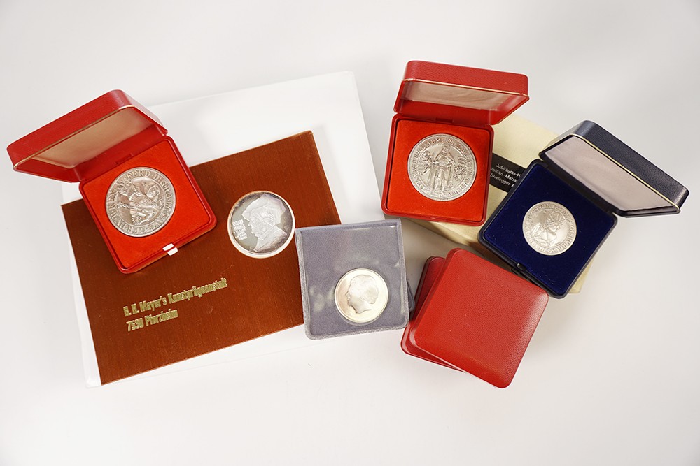 Doos met diverse moderne penninguitgiften. Voornamelijk zilver.