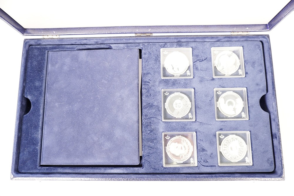 Blauwe imitatielederen cassette “Van Kroonprins tot Koning” met 24 zilveren penningen betreffende prins/koning Willem-Alexander. Incl. bijbehorende certificaten. Netto zilver: 690 gram.