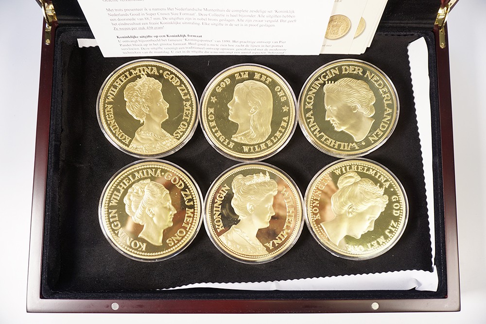 “Het is niet alles goud wat blinkt!” Kist met zes zwaar verguld bronzen muntafbeeldingen van Wilhelmina en Juliana. Totaal gewicht ca. 2700 gram.
