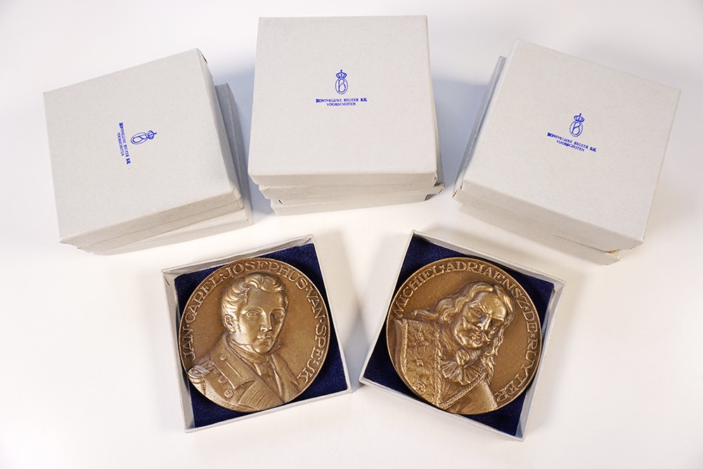 Serie historiepenningen uit 1938: ‘Onze Zeehelden’. Twaalf gietpenningen van de hand van J.J. van Goor: Jacob van Heemskerck, Pieter Pietersz. Heyn, Cornelis Evertsen de Oude, Jan van Galen, Witte Cornelisz. de With, Maarten Harpertsz. Tromp, Cornelis Tromp, Egbert Meeuwsz. Kortenaer, Michiel Adriaensz. de Ruyter, Willem Joseph Baron van Ghent, Jan Carel Josephus van Speijk, Johan Arnold Zoutman. KB V-1231/33; 1235/38; 1240/44.