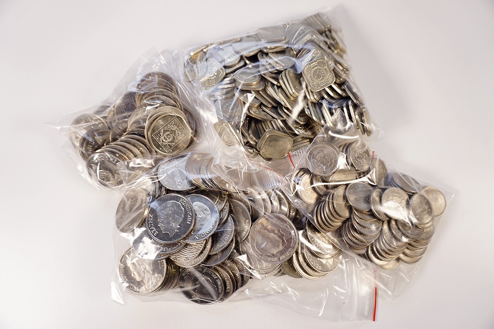 Bijna 3 kg. moderne kopernikkelen penninkjes: PTT 1998/99; Mokum 700; Rabo 100 jaar; nep-ronde en nep-vierkante stuivers.