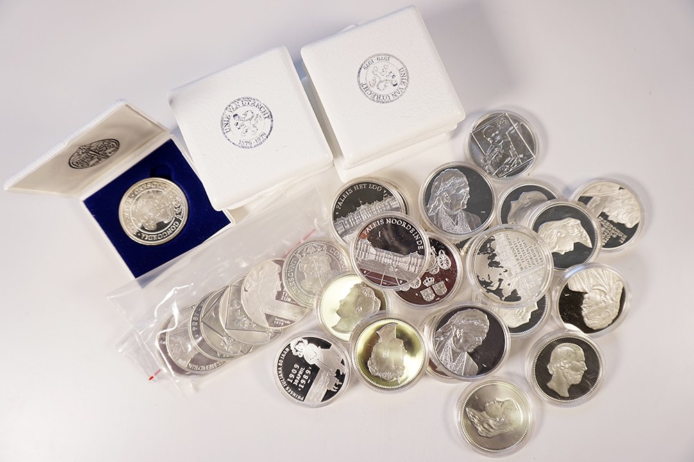 Geldkistje (met sleutel). Inhoud: zilveren penningen vervaardigd bij ’s Rijks Munt/KNM, o.a. Unie van Utrecht 1979 (8x), en div. andere penningen (29x). Totaal netto zilver: 814 gram.