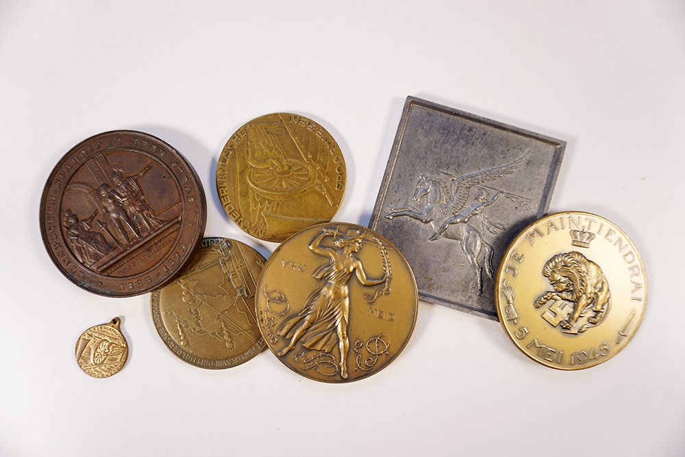 Plastic doosje met 7 ‘militaria’ penningen, brons en zink.