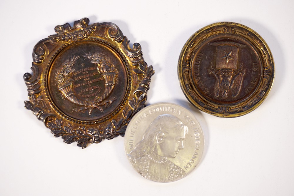Blikje (3) penningen uit Maastricht, 19e eeuws. Zilver en zilver verguld. E. Alard en Jéhotte.