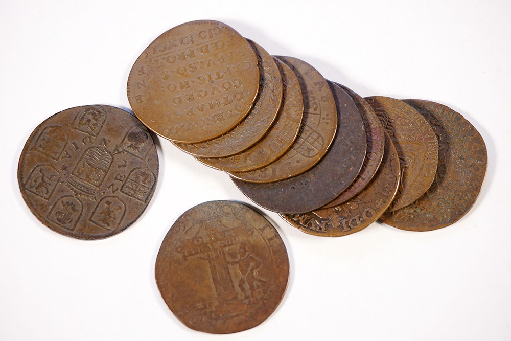 Sigarenblikje ‘Turmac’ (11) bronzen rekenpenningen/jetons eind 16e – begin 17e eeuw. Mindere kwaliteiten.