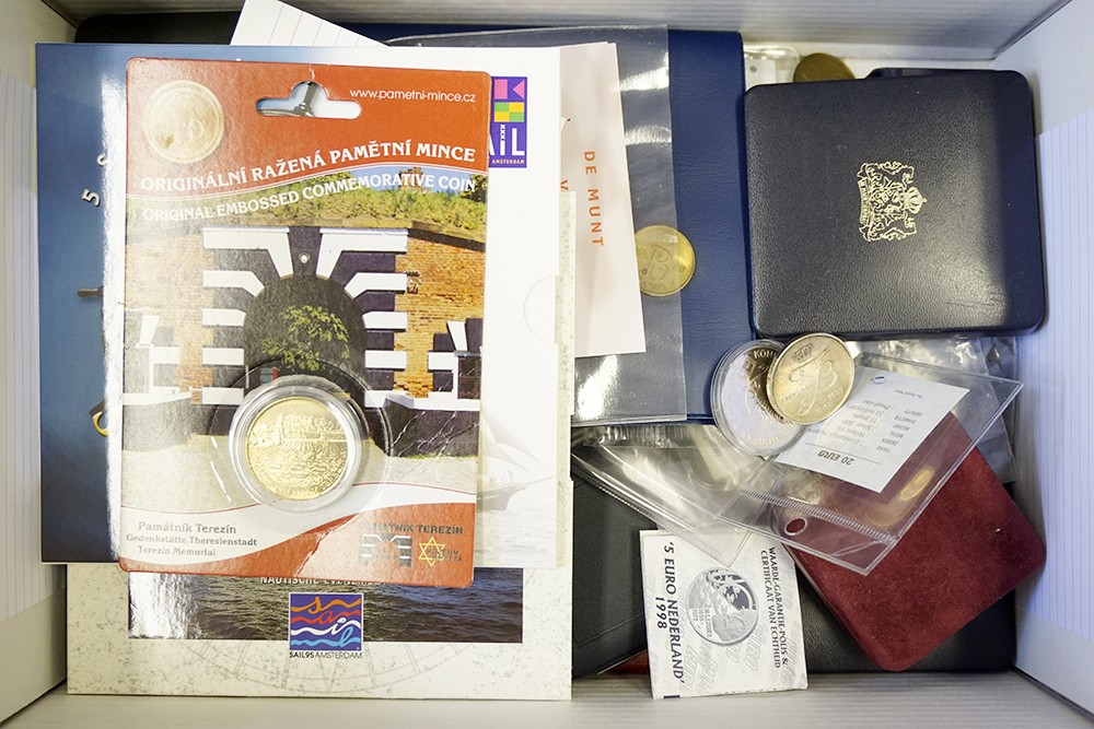 Doos vol met moderne penningen reutel o.a. ecu’s, euro’s etc. etc.