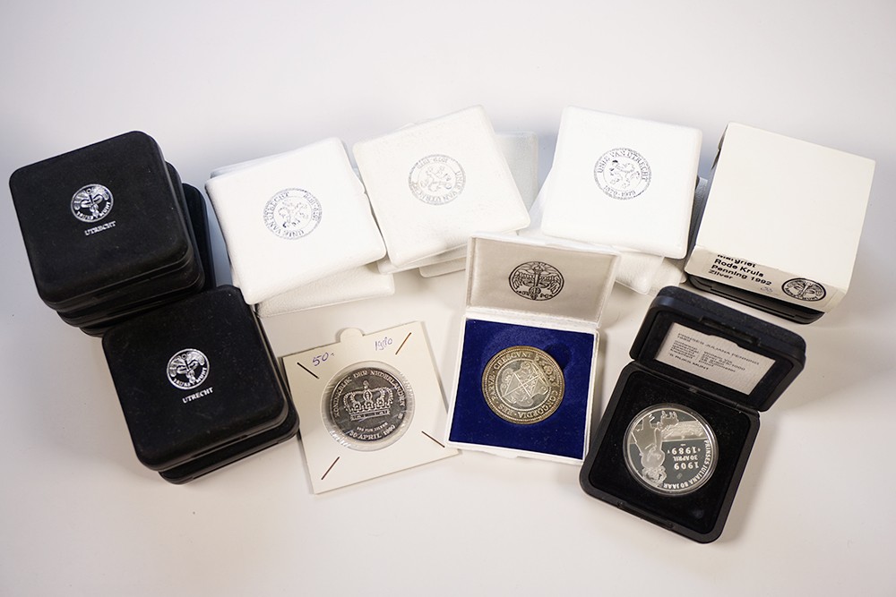 Doos met ruim 20 stuks zilveren penningen o.a. Juliana, Margriet en Unie van Utrecht.
