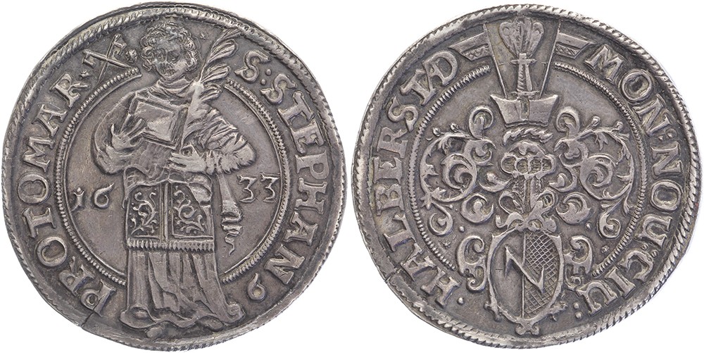 Taler 1633. Gehelmtes Wappen, MON: NOU: CIU: – HALBERSTAD / Stehende St. Stephan, S: STEPHAN – PROTOMAR. Dav. 5352; Besser/Brämer/Bürger 50.03; KM 78.1 [28,75 Gr.]. Üblicher Stempelbruch. Selten. Gutes sehr schön.