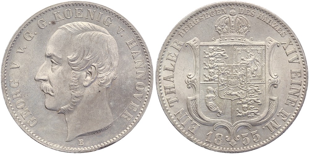 Thaler 1855 Bergsegen des Harzes. Davenport 678; AKS 158; KM 220. Minimale Randfehler. Fast Stempelglanz.