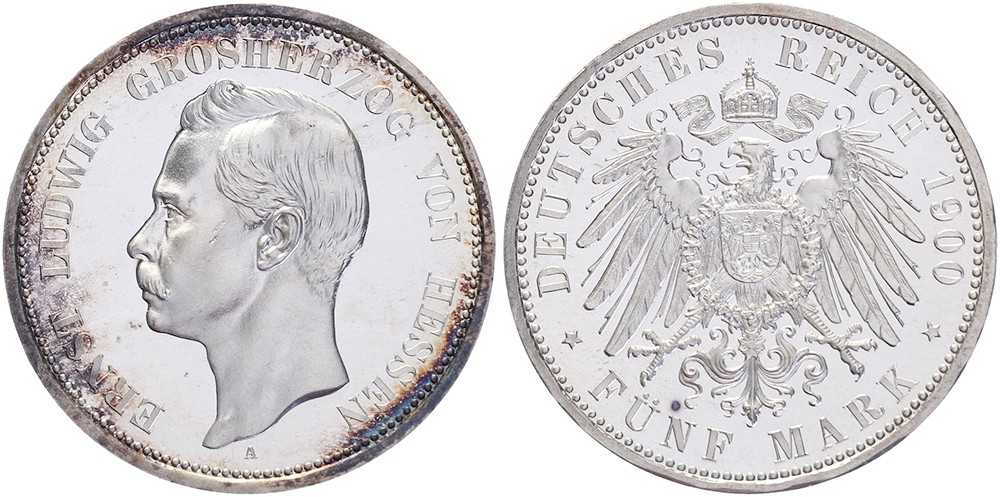 5 Mark 1900. Jaeger 73; KM 369. Unregelmäßige Patina. Polierte Platte, fast Stempelglanz. Ex Auktion 260 Adolph Hess, 28/29 Januar 1991, Los-Nr. 1034