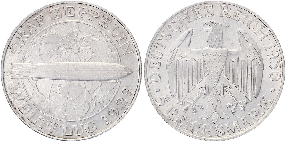 5 Mark 1930F Zeppelin. Jaeger 343; KM 68. Vorzüglich / Stempelglanz.