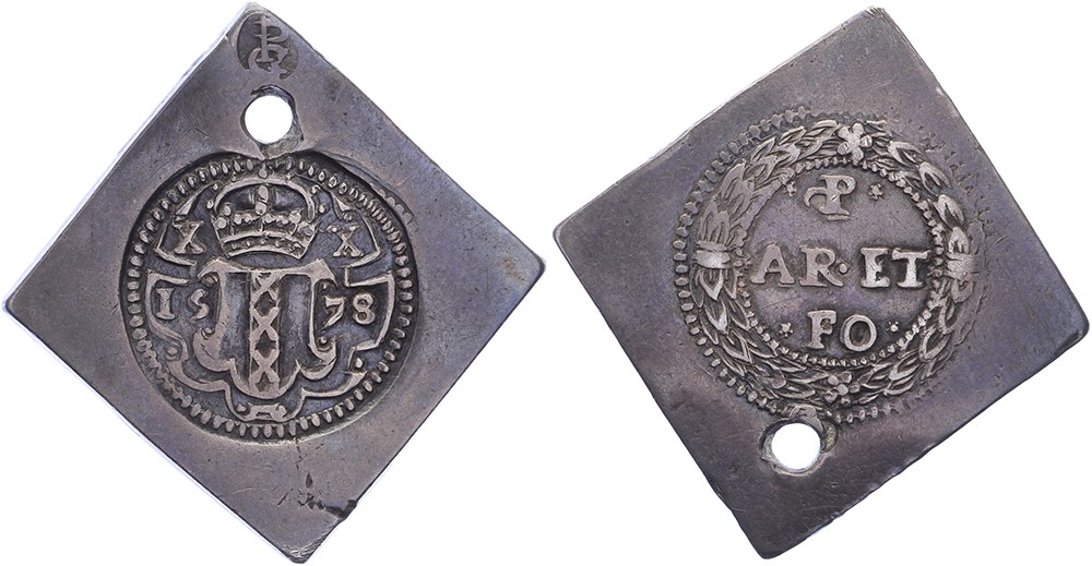 20 (XX) Stuivers 1578, met monogram PG. v.Gelder 130; Delm. 205; CNM 2.02.20; HPM 06Met doorboring. Geslagen na het beleg. Zeer fraai.