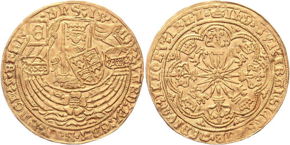 Rozenobel z.j. (1585/86). Imitatie van een gouden nobel Edward IV van Engeland.Zittende vorst in schip met rechts het wapentje van Arkel; links een gotische letter E op de achtersteven, ED WARD DI GRA REX ANGL’ Z FRAN’ DNS IB’ / Stralenzon op gebloemd kruis met lelies en gekroonde luipaarden, IHD AVT TRANSIENS PER MEDIVM ILLORV’ IBATAU 37,5 mm. [7,53 gram]. Delm. 825bis; Fr. 80, CNM 2.18.3; HPM 13. Ruim zeer fraai.