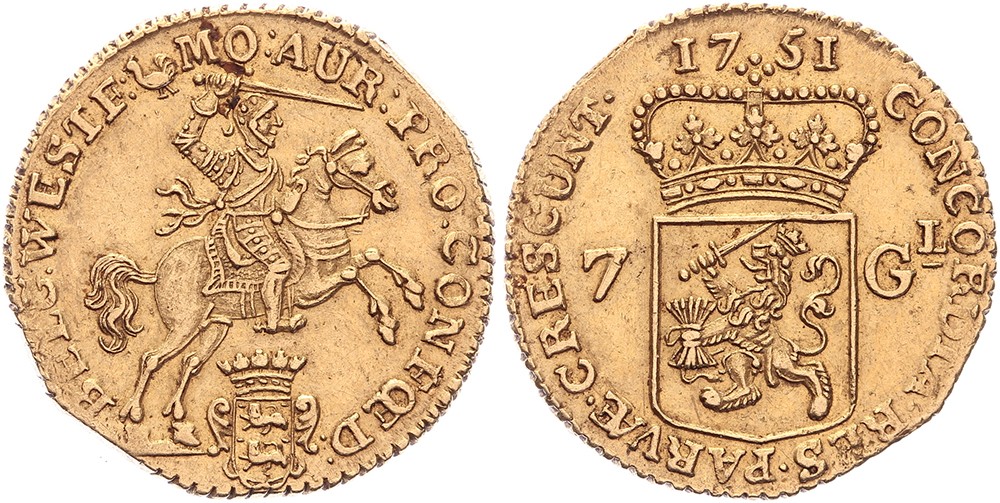 ½ Rijder of 7 gulden 1751. Delm. 844; CNM 2.46.4; HPM 10 [4,98 gram]. Randschade. Zeer fraai.