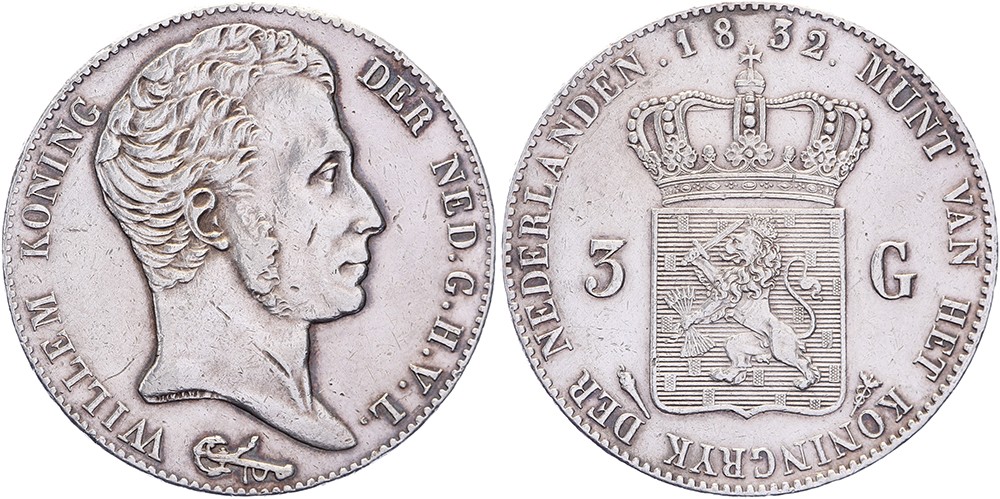 3 Gulden 1832 uit 1824 Utrecht mmt. fakkel Sch. 250a. Kras in nek Ruim zeer fraai
