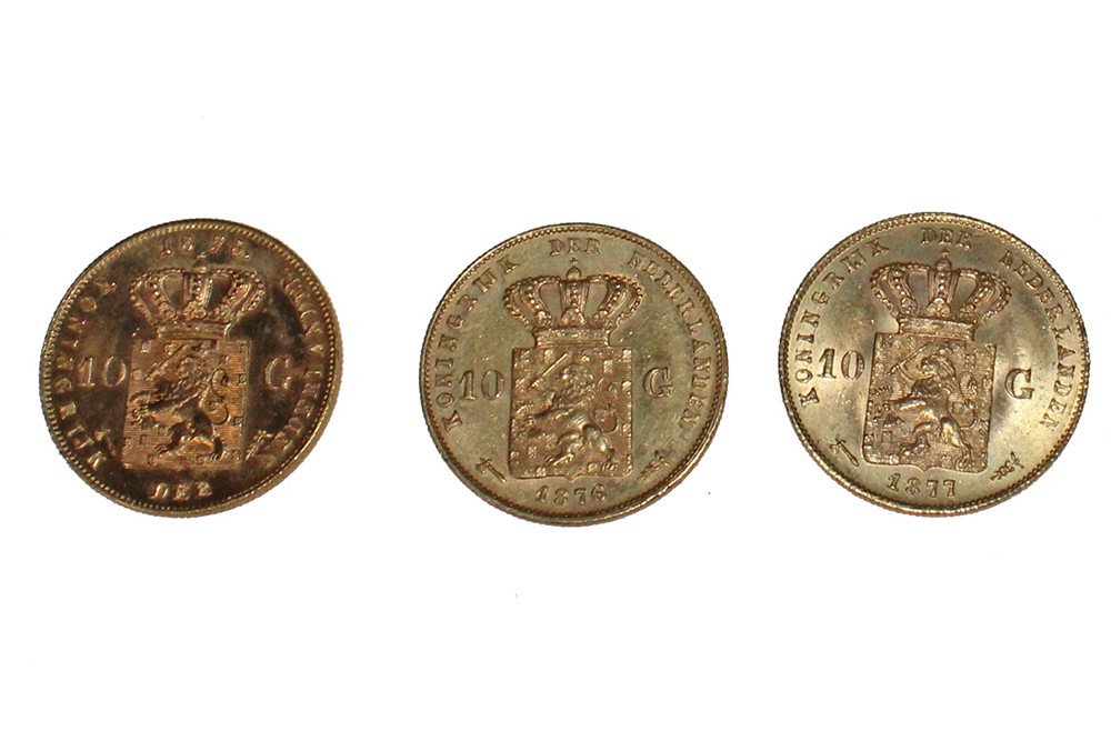 Lot (3) 10 Gulden 1875, 1876 en 1877 Sch. 549, 550 en 551 Prachtig