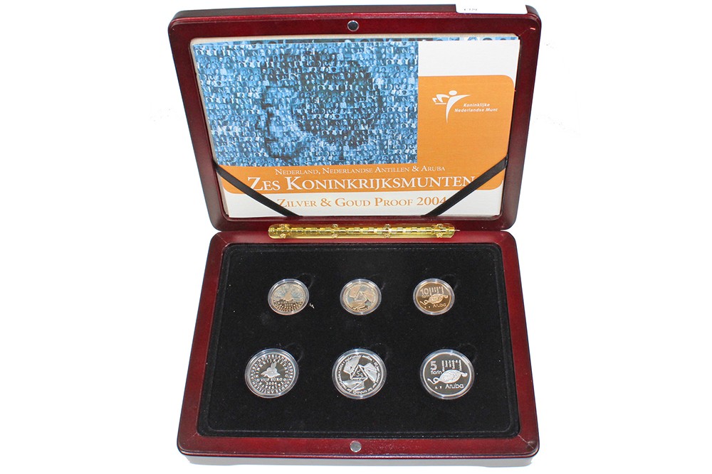Combiset 2004 Koninkrijksstatuut. NL: 5€ zilver + 10€ goud; Ned. Antillen: 5 Gld. zilver + 10 Gld. goud; Aruba: 5 Florin zilver + 10 Florin goud. Proof in houten cassette.