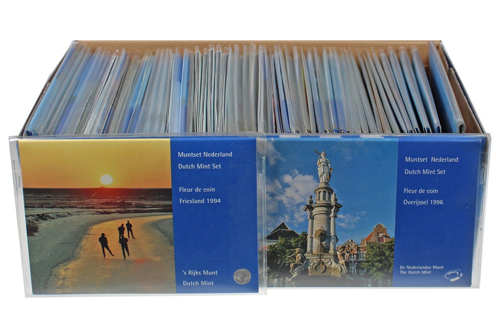 Blauwe Adidas schoenendoos met 58 provincie FDC-setjes 1987-1998.