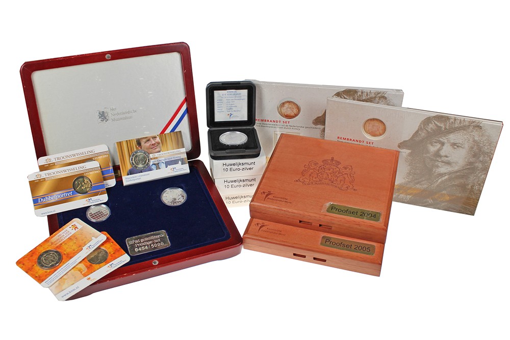 Diverse sets uit euroland: Rembrandt (met postzegel); Huwelijk (met postzegels); Van Gogh (met postzegels); proofsets; 2 € coincards; 10€ huwelijk los; smurfen 5€ (van België, in originele smurf!).