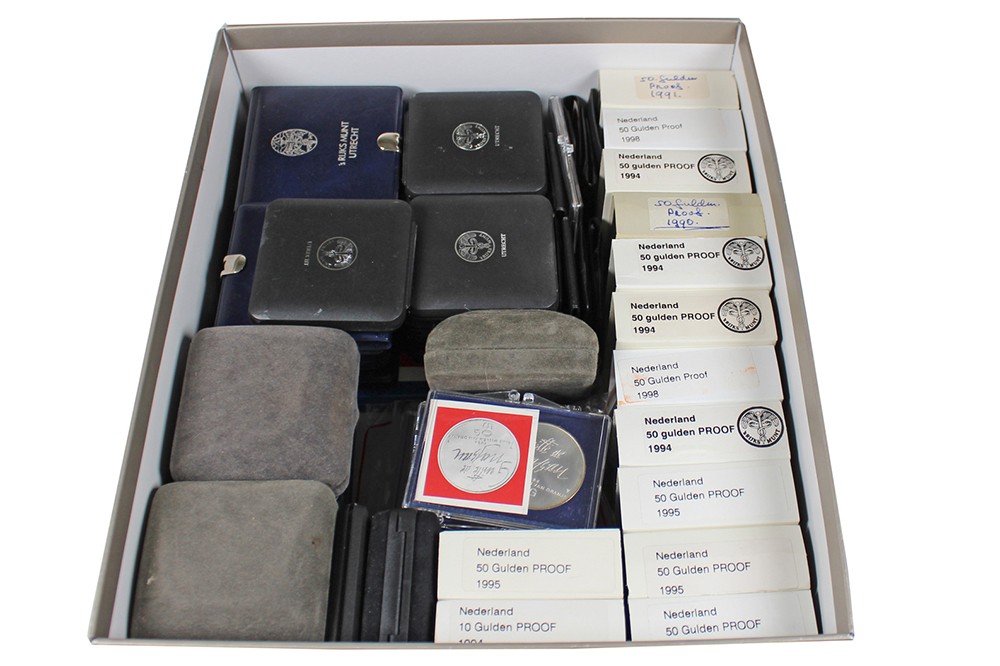 Groot lot (59x) 50-Gulden 1982-1998 in FDC en proof. Originele verpakking. Netto zilver: 1364 gr.
