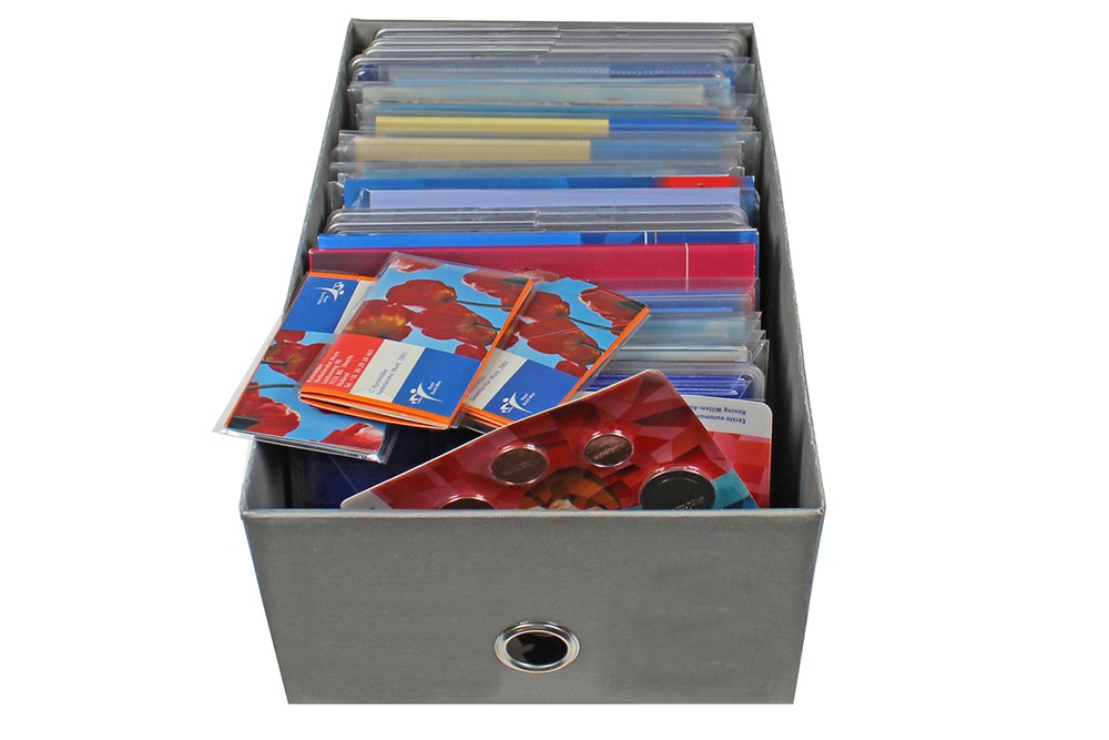 Doos met 50 stuks voornamelijk FDC-sets Nederland 1980-2000. Waarbij ook Huwelijksset 2002, Dag van de Munt 2002, minisets etc.