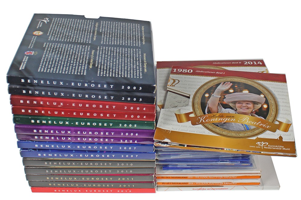Doos met ca. 30 moderne sets uitgegeven door de Nederlandse Munt, o.a. 14 stuks Benelux-sets 2003-2012.
