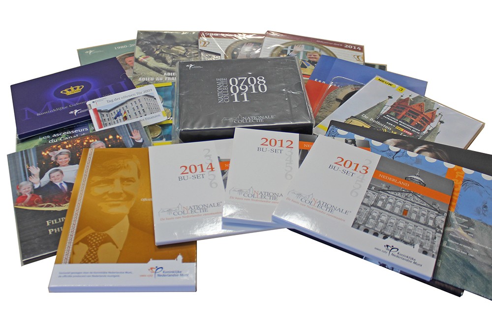 Doos met ca. 25 stuks FDC- en herdenkingssets, ook 2, 5 en 10 euro. In originele verpakking.