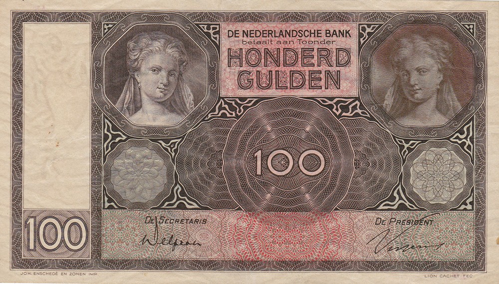 100 Gulden 1930 Luitspelende vrouw. Mev. 117a; PL 97.a [# AF 028814]. Prachtig.