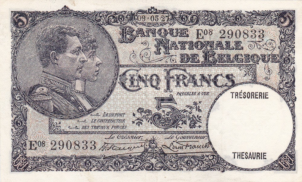 5 Francs 9-5-1927 [# E08 290833]. LA-BFB-10; Pick 97b. Prachtig.