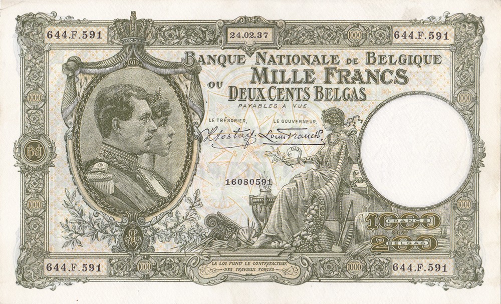 1000 Francs 24-2-1937 [# 644.F.591]. LA-BFB-97; Pick 104. Ruim zeer fraai.