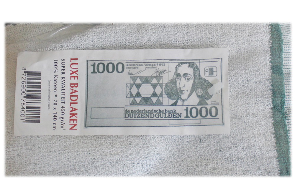 Nieuw badlaken 70x140 met opdruk 1000 Gulden 30 maart 1972 Spinoza. Het moet niet gekker worden… Oh ja, 100% katoen!