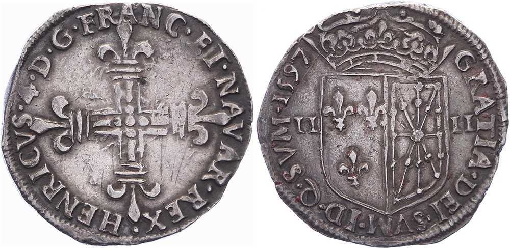Quart d’écu 1597 Saint-Palais. Ciani 1519; Dupl. 1238. TTB (VF).