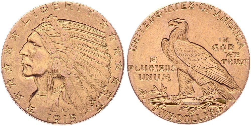 5 Dollars 1915 Indian Head. Fr. 148; KM 129. EF.