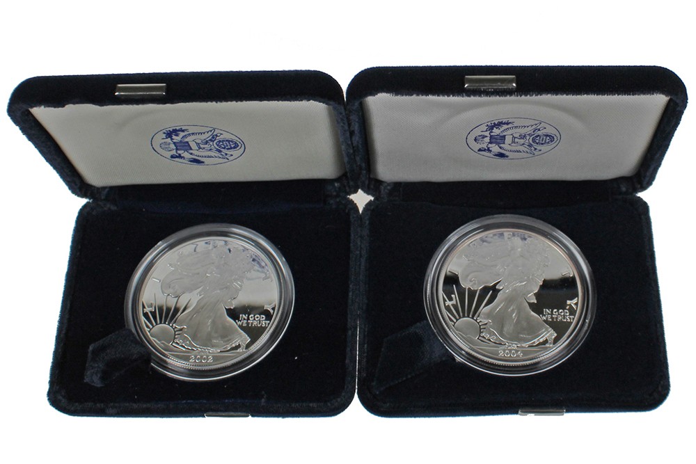 Lot (2) American Silver Eagle (troy ounce) 2002, 2004. Proof.