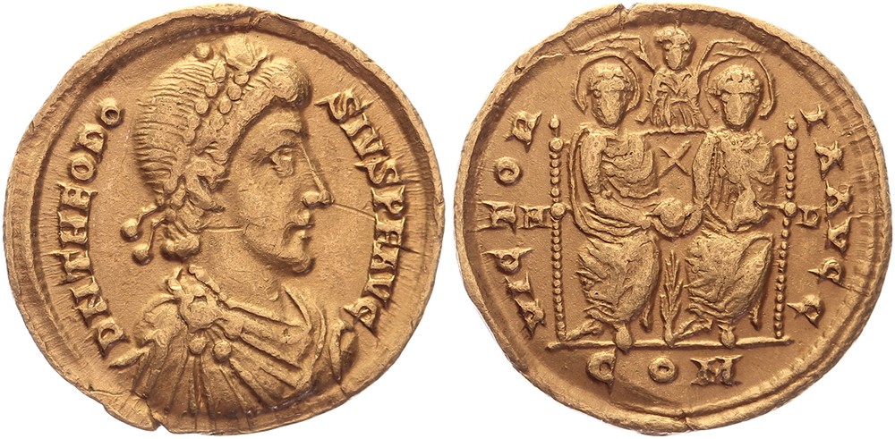 AV Solidus (4,39 gm, 21.5mm). Diademed, draped and cuirassed bust right. / Two emperors of equal height enthroned facing side by side, legs covered by drapery, supporting globe between them. Victory hovering facing in background. Palm between the emperors’ legs. COM in exergue.RIC X p.78, 8b; Sear 20412, VF.