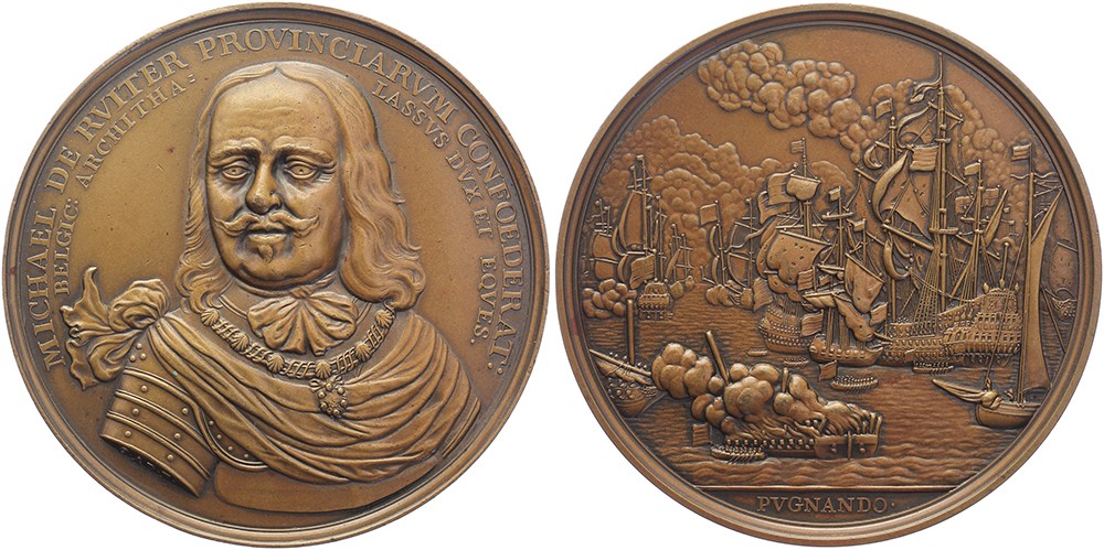 1666 Overlijden Michiel de Ruyter. Aanziend borstbeeld De Ruyter binnen omschrift. / Tafereel vierdaagse zeeslag in 1666 (naar vL II-546.2); Pugnando in afsnede. Æ 72. Later werk. Prachtig.