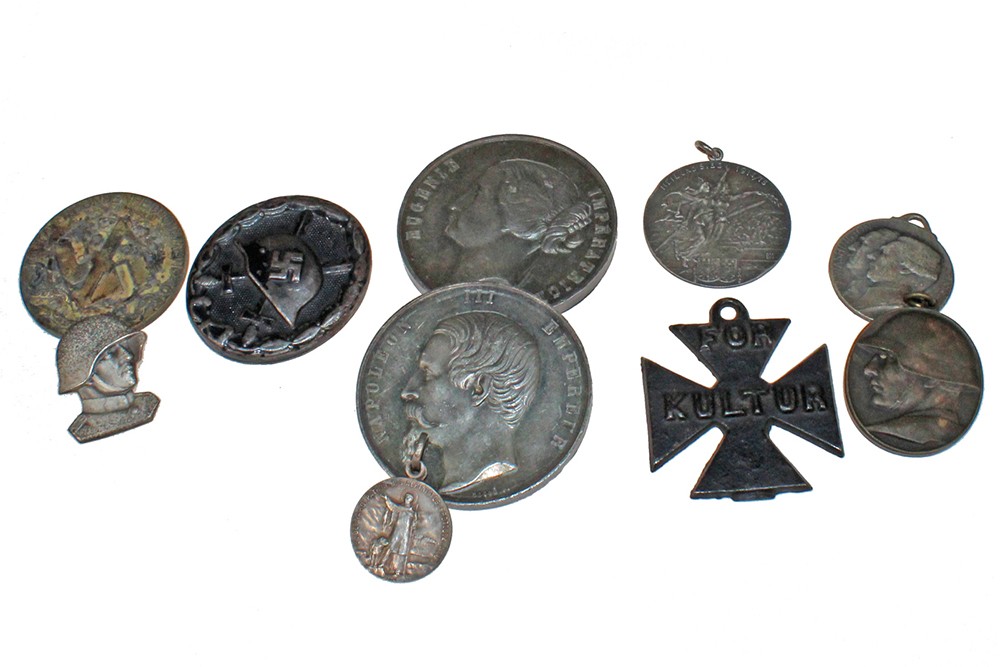 Sigarenblikje met 10 Duitse en/of Franse penningen, w.o. met hakenkruis.