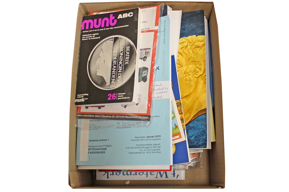 Doos met restantlot numismatisch “leesvoer”, o.a. catalogi en tijdschriften.