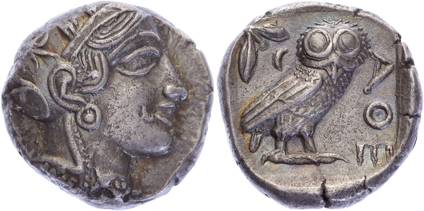Circa 454-404 BC. AR Tetradrachm (17.11 gm, 23mm). Head of Athena right, wearing earring, necklace, and crested Attic helmet decorated with three olive leaves over visor and a spiral palmette on the bowl / Owl standing right, head facing, closed tail feathers; olive sprig and crescent to left, AΘE to right; all within incuse square. Svoronos, pl. 16, 12. Toned gVF.