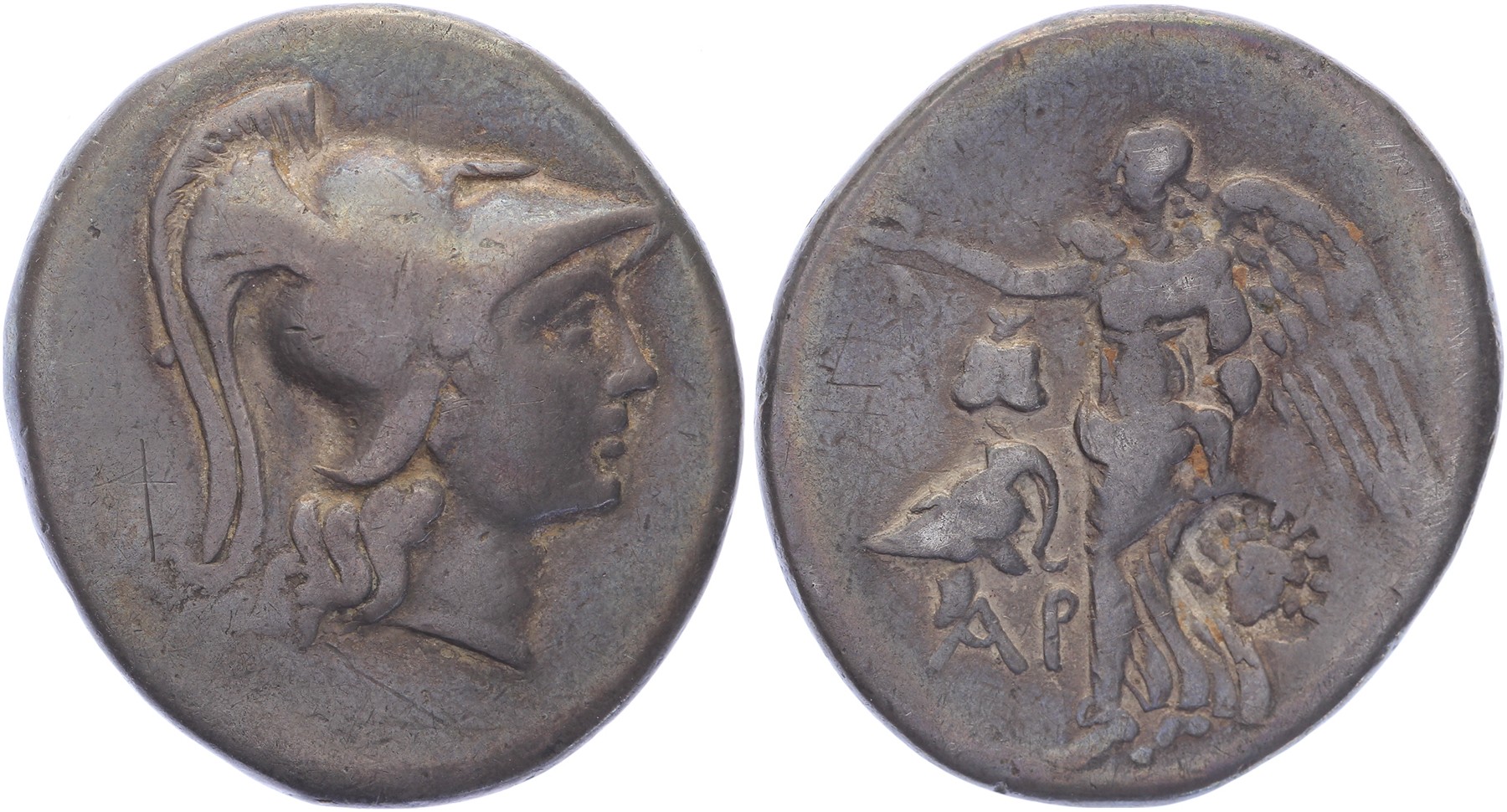 Circa 200-190 BC. AR Tetradrachm (16.23 gm, 29mm). Head of Athena right, wearing crested Corinthian helmet. / Nike advancing left, holding wreath; pomegranate above AP (magistrate) in left field; countermark: head of Helios right. For coin: SNG France 667-668; Toned VF. Kress Auc. 1968, lot 190.