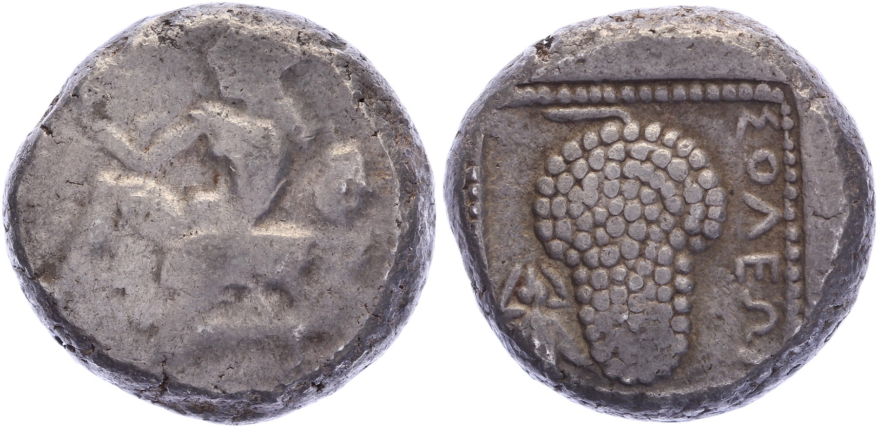 Circa 440-410 BC. AR Stater (10.67 gm, 20mm,). Amazon kneeling left, quiver and bowcase at her side, holding bow; [to right, facing head of satyr] / Grape bunch on vine; fly to lower left; all in pelleted border within incuse square. Casabonne Type 2; SNG BN 128 var. (ethnic on left, fly to right lower right); SNG Levante 40 var. = SNG von Aulock 5858 var. (same). Lightly toned, compact flan, struck with heavily worn obverse die, gF.