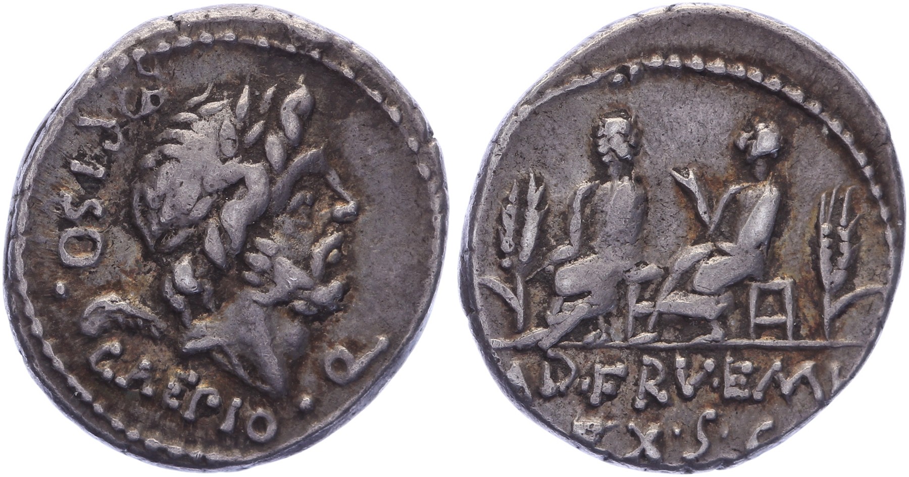 L. Calpurnius Piso Caesoninus and Q. Servilius Caepio, quaestors. 100 BC. AR Denarius (3.91 gm, 19mm). Head of Saturn right, harpa behind; uncertain symbol above / Two quaestors seated left between two stalks of grain. Crawford 330/1b; Sydenham 603a; Calpurnia 5a; cf. BMCRR 1128 and Kestner 2635 for symbol. gVF.