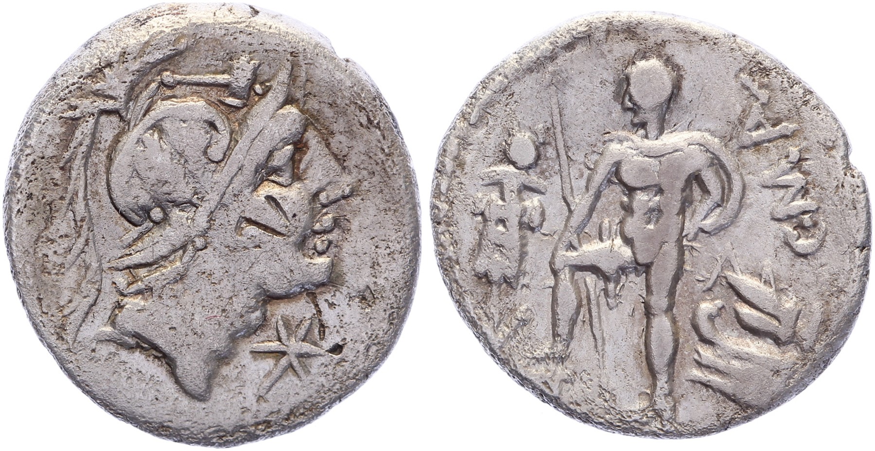 C. Malleolus. 96 BC. AR Denarius (3.70 gm, 18.8mm). Rome mint. Helmeted head of Mars right, feather on helmet; malleolus above, mark of value below chin / Warrior standing left, with right foot on cuirass, holding spear; trophy to left, grasshopper on prow to right. Crawford 335/3d; Sydenham 615a; Poblicia 6. A bit porous, aVF. Purchased from Schulman, 1964.