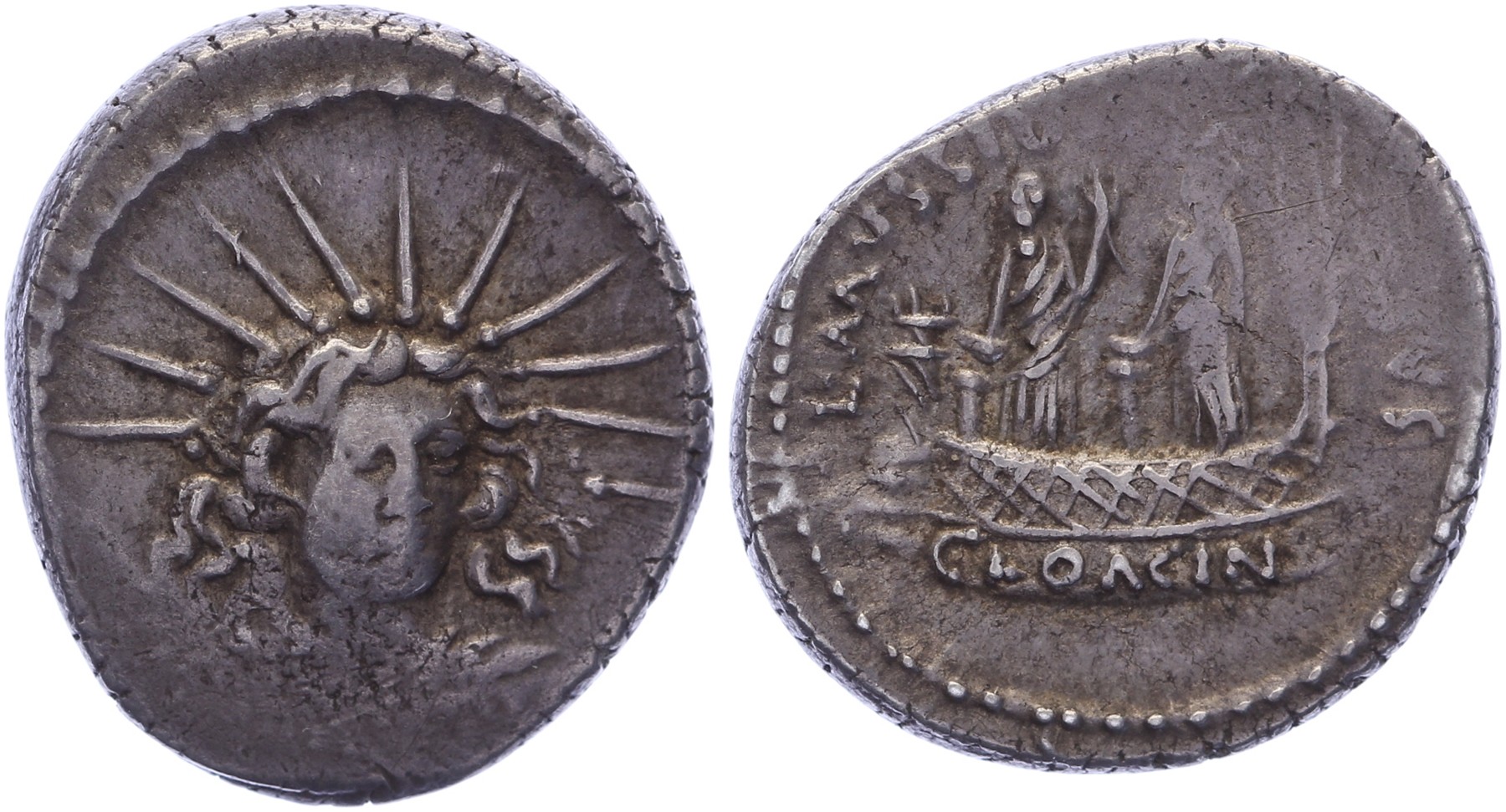 L. Mussidius Longus, 42 BC. AR Denarius (3.68 gm, 18mm). Rome mint. Radiate and draped bust of Sol facing slightly right / Shrine of Venus Cloacina: Circular platform surmounted by two statues of the goddess, each resting a hand on cippus, the platform inscribed CLOΛCIN and ornamented with trellis-pattern balustrade, flight of steps and portico on left. Crawford 494/43a; CRI 189; Sydenham 1094; Mussidia 7. Flatness on both sides, VF.