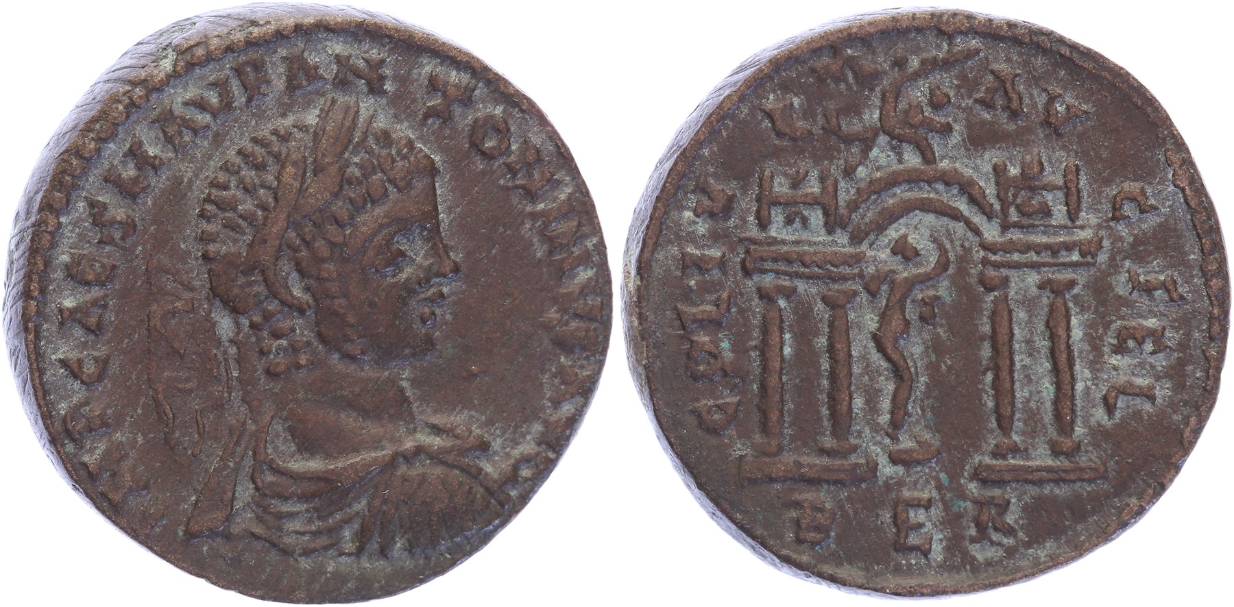 Elagabalus. 218-222 AD. AE 25mm (12.55 gm). Laureate, draped, and cuirassed bust right, seen from behind / Marsyas, holding wineskin over shoulder, standing right on low basis, within structure consisting of two decorated distyle wings and a central arch; above central arch, figure right on lion. BMC Phoenicia pg. 81, 192. aEF.