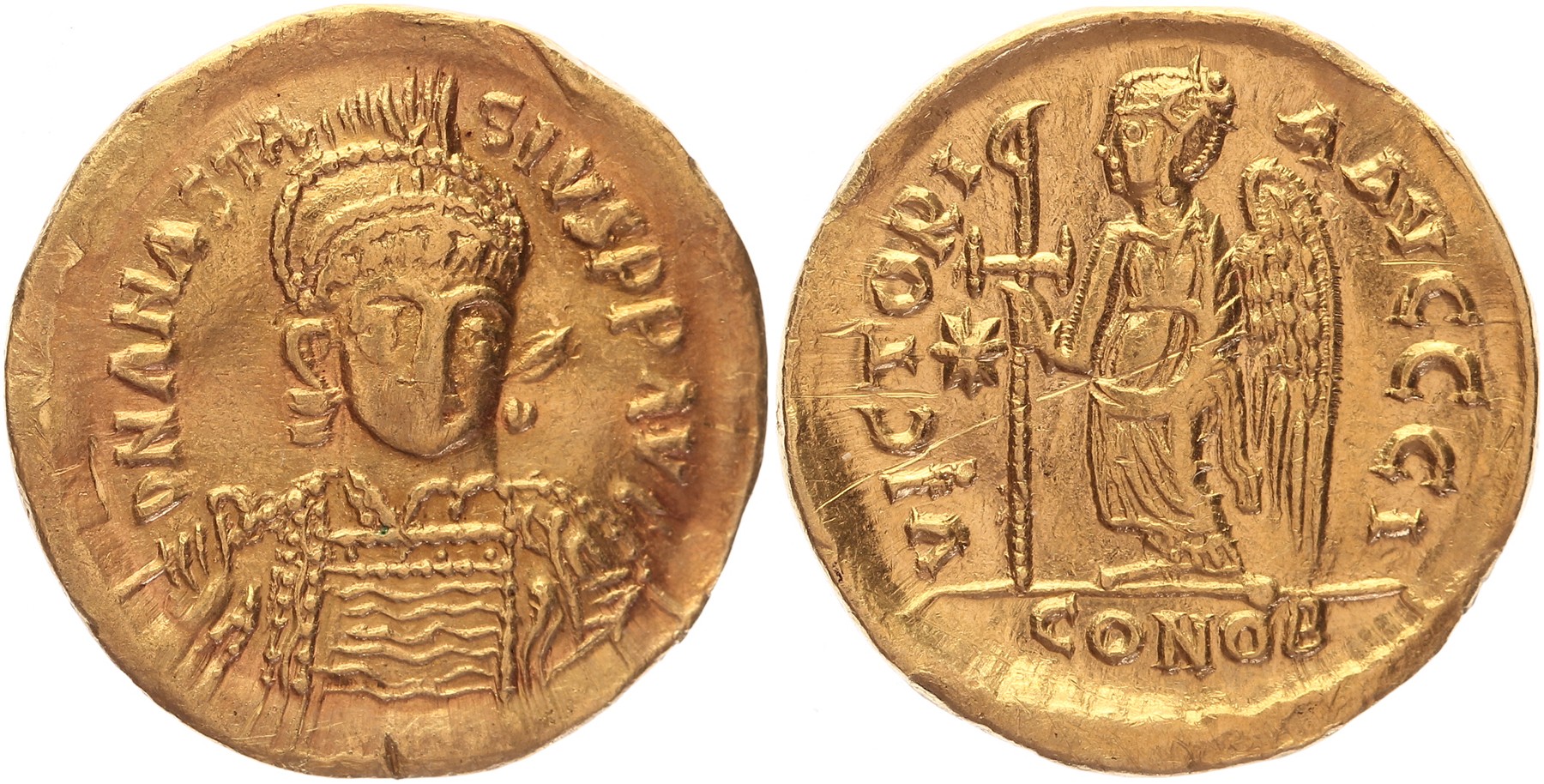 AV Solidus (4.28 gm, 19.9mm). Constantinople mint, 10th officina. Struck 507-518. Helmeted and cuirassed bust facing slightly right, holding spear over shoulder and shield / Victory standing left, holding staff surmounted by reversed staurogram; star to left; I//CONOB. DOC 7j; MIBE 7; SB 5. Clipped, reverse scratch, VF.