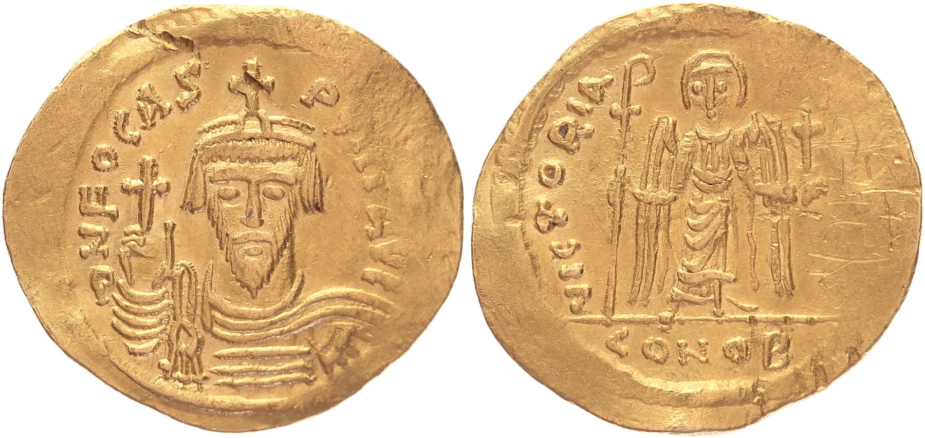 AV Solidus (4.44 gm, 22 mm). Constantinople mint, uncertain officina. Struck 604-607. Draped and cuirassed bust facing, wearing crown without pendilia, and holding globus cruciger / Angel standing facing, holding long staff surmounted by staurogram and globus cruciger; [...]//CONOB. Cf. DOC 5 (for type); MIBE 7; SB 618. Deep scratches, reverse graffiti, VF.